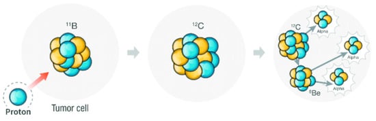 Proton therapy is an effective radiation treatment technique used in medicine, which consists of irradiating diseased tissue, most often to treat cancer, with a beam of protons [89,90]. Scheme 3 represents the Proton Boron Fusion Reaction (PBFR) between an energetic proton and 11B resulting in the generation of three α particles. The viability of applying the proton boron fusion (PBF) reaction to the proton therapy to improve its effectiveness has been studied by using the Monte Carlo method [91,92,93] and experimentally using mercaptoundecahydro-closo-dodecaborate (abbreviated as BSH, which chemical formula is [SH-1-closo-B12H11]−) [94]. Recently [95], taking advantage of the high 11B isotope content in metallabis(dicarbollides), we tested, for the first time, metallacarboranes for the PBFR as a way to improve proton therapy with the [o-FESAN]− in the U87 glioblastoma cells. A simple calculation indicates that the use of PBFR would require 1/12 of isotopically natural molecules with respect to BNCT. Furthermore, in an ideal situation, BNCT can be used synchronously on the existing 10B and Mössbauer on 57Fe, resulting in multi therapies with only one compound. Results from the cellular damage response obtained suggest that PBFR radiation therapy, when applied to boron-rich compounds, is a promising modality to fight against resistant tumors.