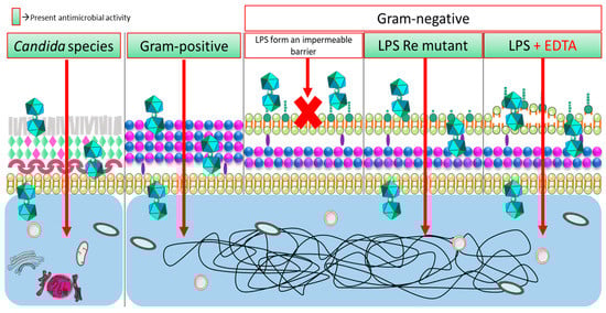 Furthermore, we demonstrated that the outer membrane of Gram-negative bacteria establishes an impermeable barrier for some of these metallabis(dicarbollide) small molecules (Scheme 4). Nonetheless, the addition of two iodine groups in the structure of the parent Na[o-COSAN] had an improved effect (3–7 times) against Gram-negative bacteria. It is important to emphasize that the most active metallabis(dicarbollides) (meta-isomers Na[m-COSAN)], Na[m-FESAN)] and the di-iodinated derivatives Na[8,8′-I2-o-COSAN], Na[8,8′-I2-o-FESAN]) are both transoid conformers in opposite to the Na[o-COSAN] that is cisoid conformer (see Figure 1), which represent structures with particular physical–chemical properties that make these small molecules more permeable to this barrier.