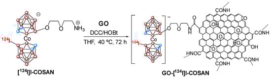 Synthesis of the graphene oxide covalently bonded to the radiolabeled COSAN (pink circles in the cluster are B or B-H and blue circles in the cluster are C-H). Reprinted/adapted with permission from Ref. [135] Copyright 2021, American Chemical Society.