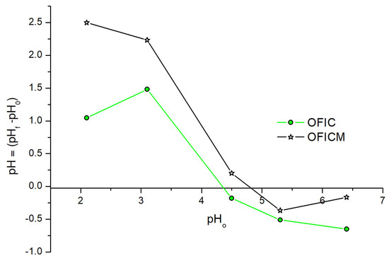 The point of zero-charge pH values (pHPZC) were obtained from the intersection of ΔpH (=pHf − pH0) curves with the pH0-axis (see Figure 1): pHPZC = 4.2 and 4.8, respectively, for OFIC and OFICM. Section 2.3 discusses the interpretation of this measure, studying the effect of pH on simple and binary adsorptions of Pb(II) and Cd(II).