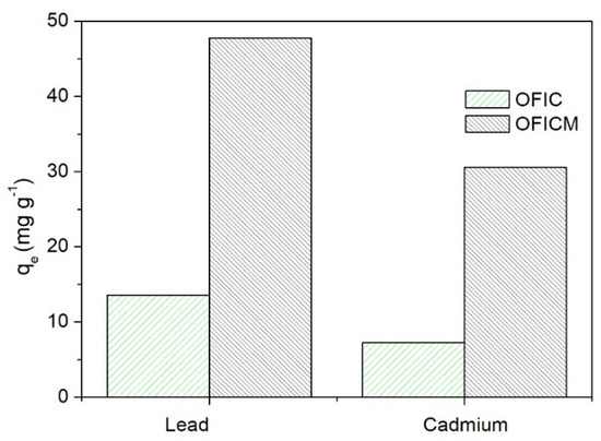 Figure 2 depicts the significant increase of Pb(II) and Cd(II) adsorption capacities, qe, by the treated biomass, OFICM. Therefore, taking into account the optimal conditions described below, the qe, to remove Pb(II) and Cd(II), of OFICM was almost four times higher than that of OFIC (see Figure 2). Several authors have reported an increase in the metal removal capacity due to the alkaline treatment of biomasses [20,22,33,34,35].