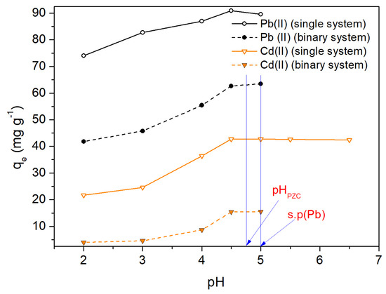 The pH of the solution is an important factor in the biosorption of heavy metals since it significantly influences the adsorbent/adsorbate interaction [38,39]. Figure 5 shows the influence of pH on the Pb(II) and Cd(II) biosorption capacities, qe, of OFICM. Therefore, for acidic pH values, we can observe that the sorption capacity, qe, for both metals increased when increasing the pH, and reached a plateau around pH 4.5. In the same figure, the pHPZC and the point at which Pb(II) starts rapid precipitation (s.p) have been marked. It is noticeable that maximum values of qe were achieved at a pH close to 4.5, which is less than pHPZC = 4.8. The interpretation of pHPZC does not explain these results, since for pH < pHPZC, the OFICM surface would be positively charged and would not favor the electrostatic attraction of Pb(II) and Cd(II). Therefore, this mechanism could not be applied to the adsorption of Pb(II) and Cd(II) on OFICM. In this regard, various mechanisms for divalent metallic biosorption on low-cost biomasses have been proposed [40], e.g., (i) complexation reactions [41], (ii) ionic exchange [40,42], and (iii) microprecipitation [43].