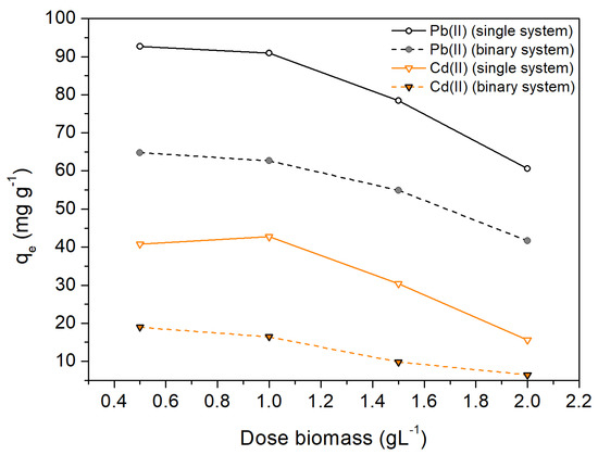 Influence of the dose of biomass on the removal capacity, qe. Experimental conditions: T = 298 K, t = 120 min, C0 = 100 mg L−1, pH = 4.5.