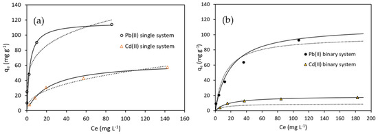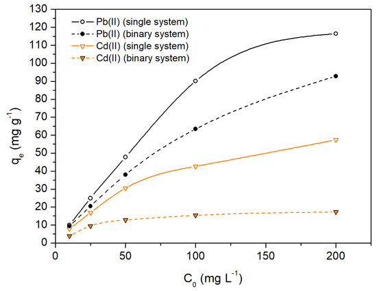 Figure 7 shows the effect of the initial metallic ion concentration, C0 (range from 10 to 200 mg L−1), on the adsorption capacity, qe, of OFICM, in single and binary systems. For both systems, it was observed that: (i) The adsorption capacity, qe, of Pb(II) and/or Cd(II) increased with C0. This behavior would be related to the driving force necessary to overcome the resistance to the mass transfer of metal ions from the solution to biosorbent [44]. (ii) Both the values and the growth trend of qe were significantly higher for Pb(II) than for Cd(II), and in turn, higher in single than in binary systems. This last difference has also been observed in the (qe vs. pH) and (qe vs. dose) curves and would indicate the significant antagonistic effect of co-cations on the binary qe of Pb(II) and Cd(II), which is discussed in the next sections.