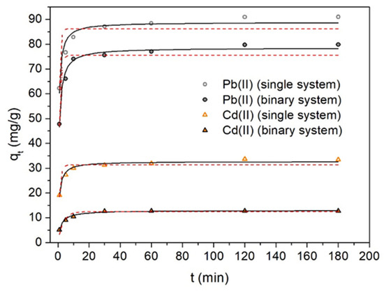 qt (amount of Pb(II) and/or Cd(II) removed per mass unit of biosorbent) vs. contact time t (min). pH 4.5, T = 293 K, OFICM dose = 1 g L−1, C0 = 100 mg L−1. Pseudo-first-order (solid line) and pseudo-second-order (dotted lines) adjustments.