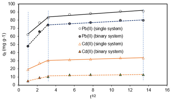 The qt vs. t1/2 plot (Figure 9) was fitted to the intra-particle diffusion Weber–Morris model. We can distinguish two well-defined parts: The first part (0 < t1/2 < 3) showed rapid growth of qt at the time t (in min), which would indicate the rapid absorption of Pb(II) and/or Cd(II) ions on the outer surface of the biosorbent. The adsorption lines did not pass through the origin, which would indicate that the adsorption process in this region is not controlled only by the intra-particle diffusion model [46]. In the second part (t1/2 > 3), a slower growth of qt with t was observed, which would be related to a gradual adsorption process, wherein Pb(II) and Cd(II) ions would enter and fill the biosorbent pores, until reaching equilibrium [11].