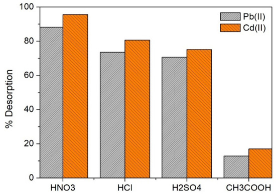 Biosorbents, coming from abundant biomasses and with high adsorption/desorption capacities, are interesting materials (e.g., to remove heavy metals) with economic and environmental viability [53]. We have studied the adsorption/desorption capacities of OFICM to find its effective regeneration and stability. In Figure 11, the results of the Pb(II) and Cd(II) desorption efficiency (%D, calculated using Equation (11)) experiments using four acidic eluents: 0.1 M of HNO3, HSO4, HCl, and CH3COOH, are presented. Acids were used because these release H+ protons, which are replaced by metallic cations such as Pb(II) and Cd(II) on the biosorbent surface [45].