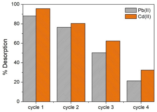 Except for CH3COOH, the other acids showed a high desorption efficiency (%D > 70), particularly for Pb(II), with HNO3 being the most efficient eluent with which Pb(II) and Cd(II) were desorbed up to %D = 96 and 88, respectively. With this eluent, up to four adsorption/desorption cycles were carried out (Figure 12). For both Pb(II) and Cd(II) adsorbates, the recovery efficiency was considerable (>50%) up to three cycles, and after that, the efficiency significantly decreased (%D < 30).