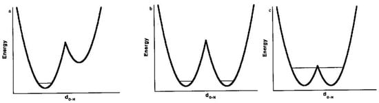 What can be said about the structure of the H-bonded species? It may be expected that as the electrostatic interactions become stronger, H approaches closer to atom B while the A–H distance increases. Correspondingly, the barrier to H transfer from A to B decreases. In the limit of a vanishing barrier, the H-bond becomes symmetric, perhaps with equal A–H and H–B distances. The possible potential-energy diagrams are shown in Figure 1 (it should be recognized that a barrier that is at or below the zero-point energy for H motion, as in Figure 1c, leaves the H-bond as effectively symmetric). Moreover, a key requirement for symmetry is equality or near-equality of the acidity constants of the two donors AH and BH, for otherwise the H will bond more strongly to one than to the other, as in Figure 1a. Such asymmetry is much more common, so that the possibility of a symmetric H-bond, as in Figure 1b or Figure 1c, generally arises only when A = B and when the A–B distance is short, 2.4−2.5 Å for OHO H-bonds [4]. Of course, such an O–O distance then requires the O–H distances to be 1.2 Å, considerably greater than the usual 1.0 Å. It should be noted that this same question also arises for the so-called halogen bonds, where a halogen is bound between two donor atoms, but we leave that topic to experts in the field [5,6].