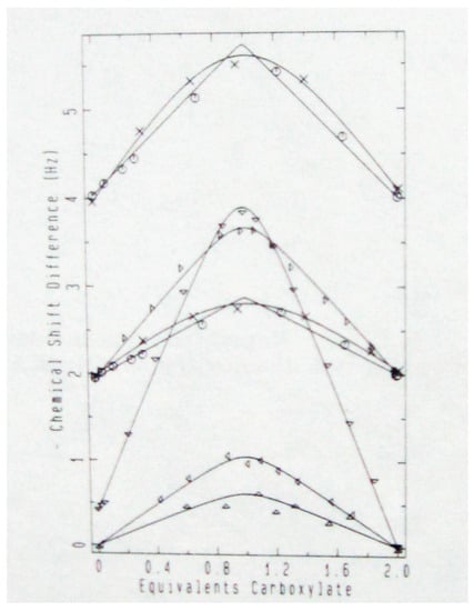 To investigate whether those monoanions are symmetric in aqueous solution, they were prepared with exactly one 18O label [42]. This was easily achieved by hydrolyzing the acid anhydride in H218O. The acid was then titrated in the NMR probe with aliquots of KOH. The carboxyl carbons of the diacid or dianion show a small 18O-induced intrinsic isotope shift Δo of −26 ppb (note that these small isotope shifts are measured in ppb, not the customary ppm). The isotope shift, 1Δ(13C) of 13C at natural abundance, rises to a maximum in the monoanion and reverts to the intrinsic isotope shift in the dianion. The results are shown in Figure 2 [42].