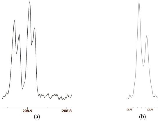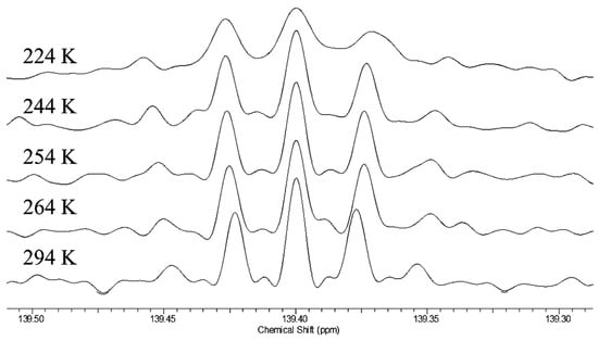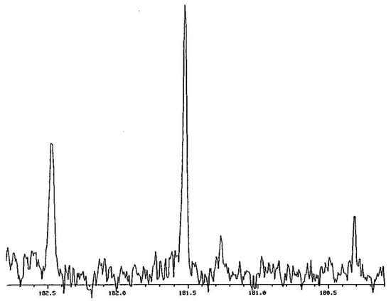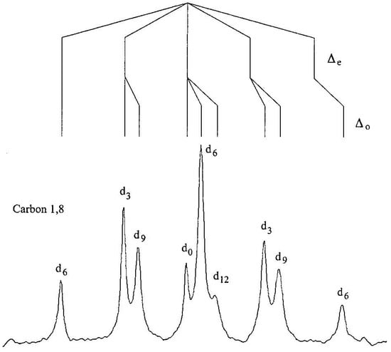 Figure 3 shows the carbonyl region in the 1H- and 2H-decoupled 13C NMR spectrum of a mixture of 12, 12-d1, and 12-d2 in CDCl3 at −37.9 °C [54]. The signal furthest downfield (at the left) can be assigned as the CH of 12-d1 and the most intense signal as the CH of 12-d0. These remain the same even without 2H decoupling. The other two signals are from carbons attached to a deuterium. On the basis of the relative amounts, the taller of these can be assigned as the CD carbon signal of 12-d1. The weakest signal, not always visible, is assigned as 12-d2.
