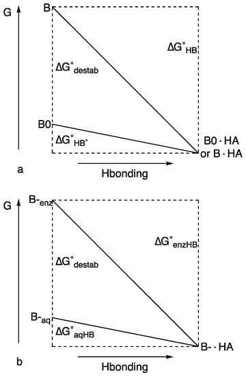 Figure 6a illustrates how relief of strain can make the H-bond appear to be unusually strong [74]. For a model base, B0, H-bond formation with HA is assumed to lower the energy by ΔG°HB°. If another base, B, is destabilized by an additional ΔG°destab, then H-bond formation with that same HA, with relief of that destabilization, will lower the energy by ΔG°HB. This stabilization is greater than ΔG°HB°, but not because of a stronger H-bond.