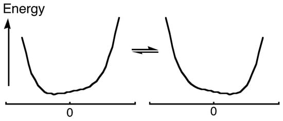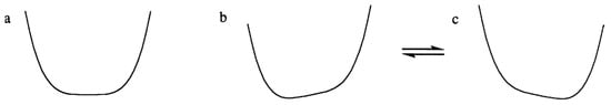 Does the observation of isotope shifts even require a double-well potential? There are certainly two tautomers, since the equilibrium between them can be perturbed by isotopic substitution. Each individual tautomer must be asymmetric. However, this does not require that the potential-energy surface be double-well. Even if the potential is intrinsically single-well, as in Figure 7a, preferential solvation of one end of the H-bond could stabilize one tautomer more than the other [91]. That would change the potential either to that of Figure 7b or to that of Figure 7c, or to more or less extreme versions of these potentials. At any instant, the H-bond would be asymmetric. However, as the solvent reorganizes, the potential switches between one like Figure 7b and one like Figure 7c. Such a single-well potential would permit an equilibrium between two tautomers, detectable through the ability of isotopic substitution to perturb that equilibrium.