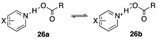 Experimentally, at −43 °C and −81 °C in CD2Cl2, the 18O-induced 13C NMR isotope shifts of the carboxyl carbons in 1:1 complexes of dichloroacetic acid with a series of pyridines show maxima [94]. The increase in isotope shift is due to perturbation of a closely balanced tautomeric equilibrium between 26a and 26b. Therefore, each of these complexes is a mixture of two tautomers, not a single structure with a single-well-potential hydrogen bond. However, the complexes of pyridine and 3-picoline were exceptions whose isotope shifts seemed to revert to the intrinsic 1Δ0. We therefore tentatively concluded that each of those two complexes is a single structure, with its hydrogen shared between nitrogen and oxygen.