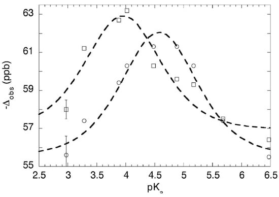 To investigate this issue more thoroughly, 18O-induced 13C NMR isotope shifts in 1:1 complexes of dichloroacetic acid with a series of nine different pyridines, including pyridine itself and 3-picoline, in CD2Cl2, were measured at −43 °C and −81 °C [96]. At these low temperatures, the OH chemical shifts approach 20 ppm, consistent with strong H-bonds. The data are shown in Figure 9. They fit Equation (7) quite well, with no reversion of any observed isotope shift to the intrinsic Δo at intermediate pKa, when the basicities of the pyridine and the carboxylate match. Therefore, each of these complexes is a mixture of two tautomers. This conclusion is contrary to the previous tentative one, and it shows that the H-bond in these complexes never becomes centered in a single well-potential.