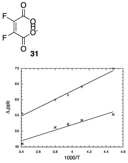 Again, isotopic perturbation can distinguish a tautomeric mixture (26a + 26b) from a single species with a shared hydrogen. The perturbation is achieved by two 18Os in the carboxyl group, which reduce the acidity of RCOOH and shift the equilibrium toward 26b. The isotope shift is detected as the chemical shift of the carboxyl carbon of the 18O2 acid, relative to that of the 16O2 acid [94]. The observed isotope shift is the sum of an intrinsic shift 1Δ0 and a shift 1Δeq due to perturbation of the equilibrium between the two tautomers. This latter can be shown to be given by Equation (7), where δOH and δO− are the chemical shifts of the carboxyl carbons in tautomers 26a and 26b, respectively, Ke is the equilibrium constant [26b]/[26a], averaged over 16O and 18O acids, and K is the ratio Ka(16O)/Ka(18O), which is ~1.02 [95]. This 1Δeq approaches zero for large or small Ke and reaches a maximum when Ke = 1. However, if the double-well potential of separate tautomers 26a and 26b becomes single-well, then there will be only a single species, and 1Δeq will disappear.