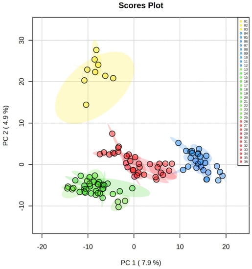 Figure 1 shows the PCA score plot with a covariance of the samples through two coordinate axes or components; in this sense, the samples that were close in these components are likely to have similar chemical patterns and, therefore, present similar metabolic profiles. The first component (PC-1) accounted for 7.9% of the total variance, while PC2 explained 4.9%. These results showed a clear clustering of the samples around 4 main groups, which were classified on color-based coding as described in Figure 1.