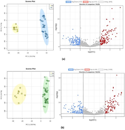 Once the metabolic profiles were acquired, the files were transformed into MzXML by using the tool MS Convert 3.0 from Proteowizzard. Chromatogram alignment, background noise subtraction, and feature detection were carried out at the online platform XCMS (Version 3.7.1) https://xcmsonline.scripps.edu/ (accessed on 1 April 2022). The data were filtered according to their coefficient of variation (equal to or less than 30%), and data matrices were generated. Principal component analysis (PCA) was applied to all the data to determine the clustering in the samples. Normalization was performed by the total sum of intensities from the mass spectra, logarithmic transformation, and auto-scaling of data were carried out with MetaboAnalyst software (Version 5.0.) (https://www.metaboanalyst.ca/MetaboAnalyst/home.xhtml) (accessed on 15 July 2022).