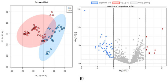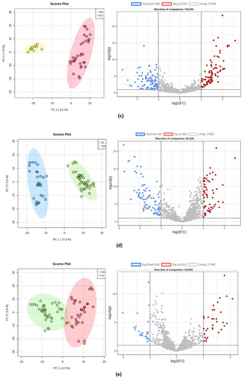 Principal component analysis score plots (left) and volcano plots (right) of groups analyzed in pairs: (a) yellow vs. blue, (b) yellow vs. green, (c) yellow vs. red, (d) blue vs. green, (e) green vs. red, (f) blue vs. red. In volcano plot graphs, the y-axis represents the p-value with a threshold of 0.1, and the x-axis represents the fold change (FC) with a threshold of 2.0.