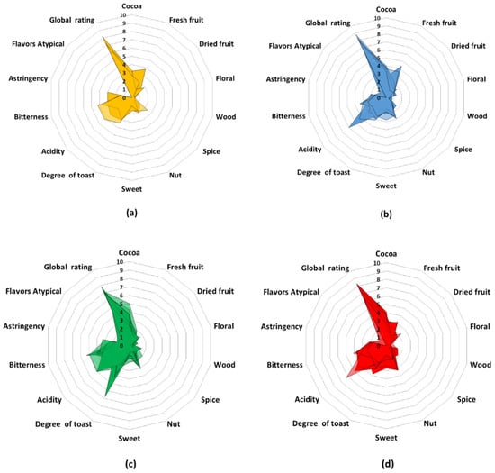 Radial plots of the sensory analysis of the cocoa samples grouped according to the results of the PCA: (a) yellow, (b) blue, (c) green, and (d) red groups.