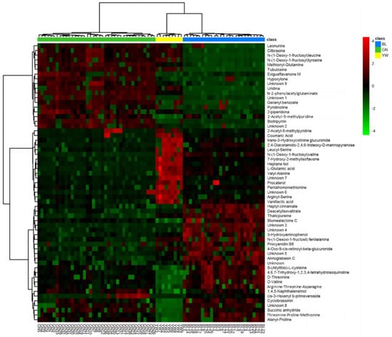 Heat map of the putatively identified metabolites for each group of samples. On the right side, the labels of the metabolites identified are shown, and at the bottom, the names of the samples are listed.