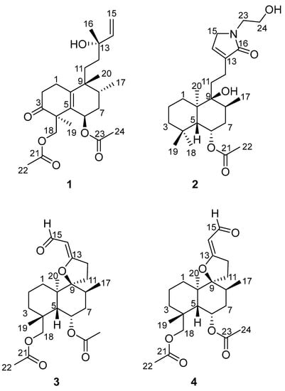 - Hanson, J.R.; Nichols, T.; Mukhrish, Y.; Bagley, M.C. Diterpenoids of terrestrial origin. Nat. Prod. Rep. 2019, 36, 1499–1512. [Google Scholar] [CrossRef] [PubMed]
