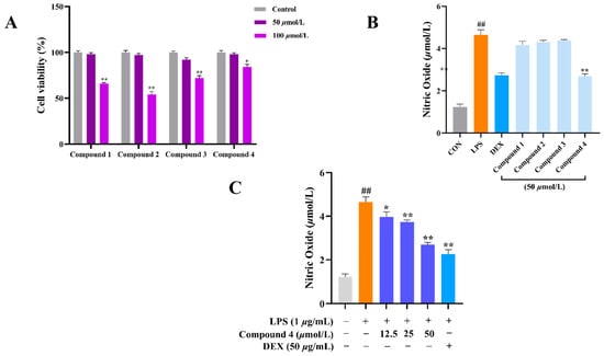 - Xi, Y.; An, L.J.; Yang, X.Y.; Song, Z.T.; Zhang, J.; Tuerhong, M.; Jin, D.Q.; Ohizumi, Y.; Lee, D.; Xu, J.; et al. NO inhibitory phytochemicals as potential anti-inflammatory agents from the twigs of Trigonostemon heterophyllus. Bioorg. Chem. 2019, 87, 417–424. [Google Scholar] [CrossRef]