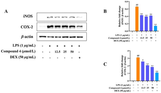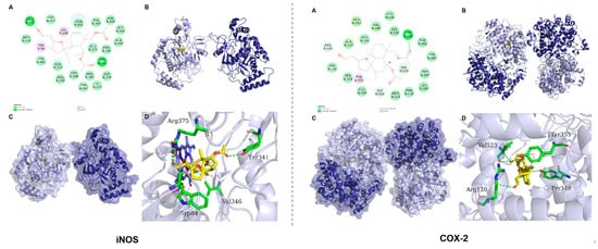 2.3. Predicted Binding Modes of Compound 4 and Both iNOS and COX-2 Using Molecular Docking Analysis