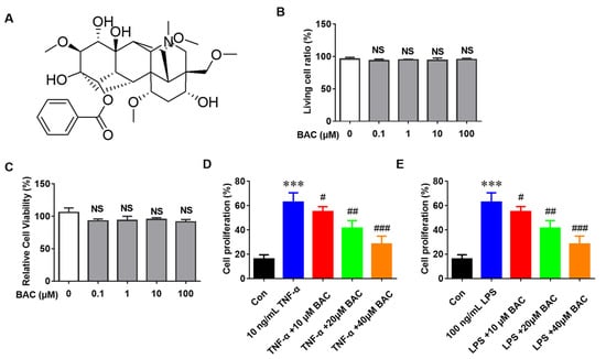 The chemical structure of BAC and its effects on cell proliferation and viability. (A) The chemical structure of BAC. (B,C) Cell viability was measured by Flow cytometry and CCK-8. (D) Detection of cell proliferation after treatment with TNF-α (10 ng/mL) and BAC (0, 10, 20, and 40 μM) for 24 h. (E) Detection of cell proliferation after treatment with LPS (100 ng/mL) and BAC (0, 10, 20, and 40 μM) for 24 h (Mean ± SD; vs. Con, *** p < 0.001; vs. TNF-α, # p < 0.05, ## p < 0.01, ### p < 0.001; NS = not significant).
