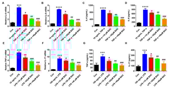 BAC significantly inhibited the gene and protein expression level of inflammatory cytokines in TNF-α/LPS-induced HaCaT cells. (A–H) mRNA level of IL-6, IL-8, TNF-α, and IL-17, and the protein level of IL-6, IL-8, TNF-α, and IL-17 in the treated cells with TNF-α (10 ng/mL) and BAC (0, 10, 20, and 40 μM), respectively. (Mean ± SD; vs. Con, **** p < 0.0001, *** p < 0.001; vs. TNF-α, # p < 0.05, ## p < 0.01, ### p < 0.001).