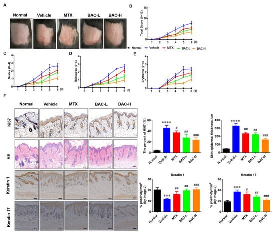 The accumulation of inflammatory factors, hyperproliferation of keratinocytes, and abnormal expression of parakeratosis in the skin can lead to red scaly lesions, hyperplasia, and micro-abscesses [22]. To evaluate the therapeutic effects of BAC, IMQ-induced C57BL/6 mice with psoriasis-like skin inflammation were used as the disease model. Based on this model, red scaly plaques and hyperplasia were observed in the C57BL/6 mice (Figure 3A). Therapeutically, BAC overtly attenuated the experimental symptoms in a dose-dependent manner compared with the MTX-treated group, including scales, thickness, and erythema (Figure 3B–E). The HE results showed that epidermal hyperplasia and infiltration of inflammatory cells significantly decreased the epidermal thickness and inflammatory cell infiltration in the model group after treatment with BAC. In addition, compared with the model group, the Ki-67 expression of the BAC group was significantly reduced, indicating that BAC could reverse the IMQ-induced increase of keratinocyte proliferation. BAC increased keratin 1 expression and reduced the expression of keratin 17, which contributed to an improvement in skin lesions (Figure 3F). The data indicated that BAC had an excellent therapeutic effect on psoriasis.