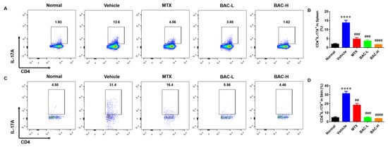 BAC reduced the accumulation of Th17 cells in IMQ-induced mice. (A,B) The frequency of Th17 cells in the spleen in IMQ-induced mice after analysis of flow cytometry. (C,D) The frequency of Th17 cells in the skin of IMQ-induced mice after analysis of flow cytometry (Mean ± SD; vs. Normal, **** p < 0.0001; vs. Vehicle, ## p < 0.01, ### p < 0.001, #### p < 0.0001).