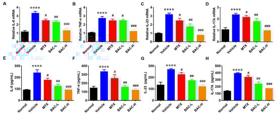 BAC significantly inhibited the gene and protein expression level of inflammatory cytokines in IMQ-induced mice. (A–H) The mRNA level of IL-6, TNF-α, IL-23, and IL-17A, and the protein level of IL-6, TNF-α, IL-23, and IL-17A, respectively (Mean ± SD; vs. Normal, **** p < 0.0001; vs. Vehicle, # p < 0.05, ## p < 0.01, ### p < 0.001).