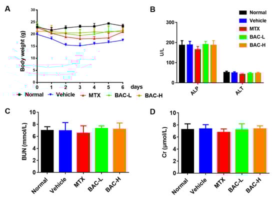 Safety analysis of BAC for dosing IMQ-induced mice. (A) Body weight of mice in each group. (B–D) Serum level of ALP/ALT, Cr, and Bun, respectively.
