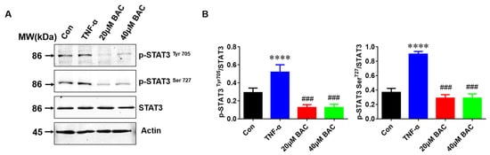 STAT3 distinctly contributes to the inflammatory response in psoriasis. It has been reported that sunitinib reduces imiquimod-induced psoriasis-like inflammation by inhibiting p-STAT3 [28,29]. As shown in Figure 7, the data suggested that both p-STAT3 Tyr705 and p-STAT3 Tyr727 were significantly increased after exposure to TNF-α, especially p-STAT3 Tyr727. On the contrary, BAC treatment strongly inhibited STAT3 phosphorylation in TNF-α-treated HaCaT cells.