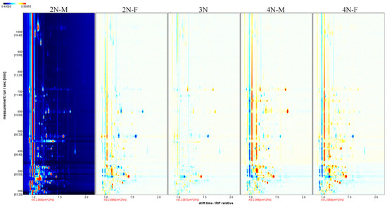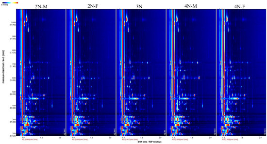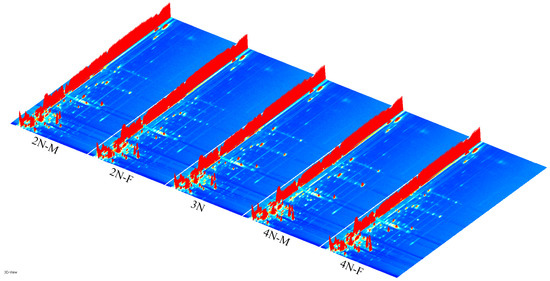 Three-dimensional spectrum of the volatile components for diploid male oyster (2N-M), diploid female oyster (2N-F), triploid oyster (3N), tetraploid male oyster (4N-M) and tetraploid female oyster (4N-F), evaluated using GC-IMS. Note: the bright spot denotes a volatile component, and its hue spans from blue to red, signifying the concentration of the compound from less to greater. The x-axis, y-axis, and z-axis indicate the migration time (normalized treatment), retention time(s) of gas chromatography, and peak intensities, respectively.