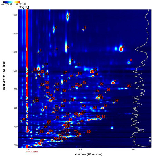 Qualitative analysis of different oyster samples by GC-IMC with 2N-M was taken as an example. The figures in the figure correspond to those in Table 1.
