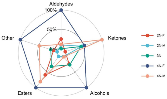 Ketones (38.4%), aldehydes (14.26%), alcohols (18.5%), and esters (12.8%) were the primary components of the volatile aromatic compounds detected in the oyster samples. Differences in VOCs from different samples are shown in Figure 5. Compared with diploid and triploid oysters, tetraploid oysters exhibited significantly increased levels of volatile components (p < 0.05), indicating that oysters with different ploidy levels greatly differed in flavor profiles. Thus, changes in ploidy also resulted in altered compositions of volatile components. In addition, the ketone levels in 2N-M oysters were significantly higher than in 2N-F oysters, while levels of aldehydes, alcohols, and esters were significantly higher in 2N-F oysters than in 2N-M oysters. The same observation was also made for tetraploid oysters, indicating differences in volatile flavor compounds between male and female oysters.