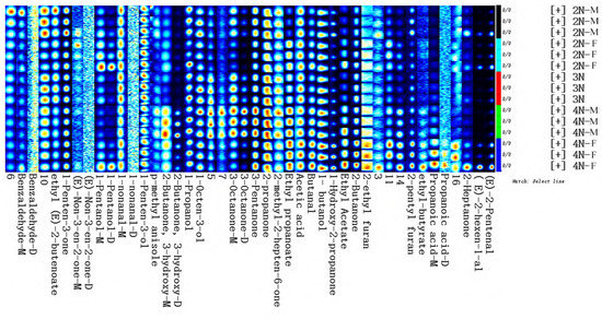 An MXT-WAX metal chromatographic column was used for GC-IMS, which exhibited an inner diameter of 0.53 mm and a film thickness of 1 μm. The column temperature was set to 60 °C, the carrier gas/drift gas was dinitrogen (99.999% purity), and the temperature of the ion mobility spectrum was 45 °C. Carrier gas flow rates were set at 0–2 min, 2 mL/min; 2–10 min, 10 mL/min; 10–30 min, 100 mL/min, and a drift gas flow of 150 mL/min. The analysis time was 30 min.