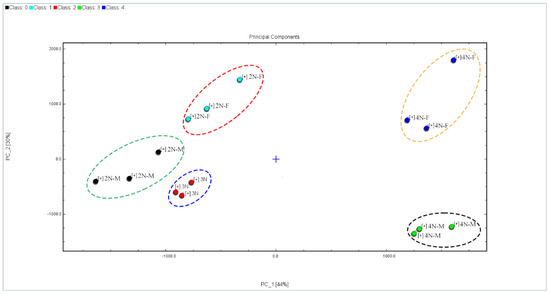 To better visualize the sample data and remove noise, the dimensionality of the original data was reduced, followed by the classification of samples using PCA (Figure 7). PCA is a multivariate statistical method used to assess correlations between multiple variables and can be used to comprehensively evaluate multidimensional problems. Generally, when the cumulative contribution rates of PC1 and PC2 reach 60%, the PCA model can be used to adequately separate different samples. PCA was used to distinguish oysters with different ploidy profiles in this study, with contributions of PC1 and PC2 of 44% and 30%, respectively (total cumulative contribution of 74%), indicating distinct characteristic differences in flavor compounds between male and female oyster samples with different ploidy profiles. The samples were clearly separated in the ordination and the samples with high correlations were distributed in the same region (Figure 7). The tetraploids were clustered separately from the other samples, and exhibited a positive PC1 score, indicating that ploidy differences were associated with significant differences in VOC profiles. The VOC compositions of the diploids were relatively similar to those of the triploids, indicating the presence of more similar VFCs within diploid and triploid oysters compared to tetraploid oysters, as reflected also in more similar sensory characteristics. In addition, the 4N-M and 4N-F samples were clearly distinguished through PC2. Similar differences were observed for the diploid samples, indicating that gender differences can affect VFC profiles in oysters. Thus, GC-IMS techniques can effectively produce distinguishable VOC profiles of tetraploid and diploid oysters, triploid oyster samples, and different sexes of diploid/tetraploid oyster samples.