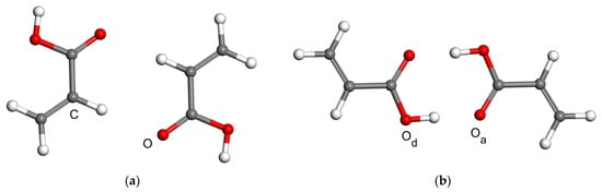 The acrylic acid dimer (AAD) is one of systems for which the double proton transfer was characterized experimentally (see the review [42]). In particular, the group of Caminati applied microwave spectroscopy measurements to the polar form of AAD and estimated a barrier for the exchange of its hydroxyl protons [43]. Here, nonpolar forms of AAD are considered. Namely, the model for an investigation of C–H⋯O H-bonding has both AA units with cis configuration of hydroxyl group relative to vinyl group (see Figure 2a), while that orientation is trans in the model describing O–H⋯O interactions (Figure 2b). The full geometry optimization for these two models was carried out at the MP2/aTZ level as in the previous work on molecular complexes [36]. The distance, , between atoms marked in Figure 2a with “C” and “O”, and in Figure 2b with “Od” and “Oa”, is 341 and 264 pm, respectively, in the pertinent MP2/aTZ minima. All other geometric parameters of these minima can be inferred from their coordinates provided in “min” sheets inside the Supplementary Materials files “CHO.xlsx” and “OHO.xlsx”. It should be noted that in the single-crystal X-ray diffraction structure of AA that features layers of dimers with O–H⋯O hydrogen bonding, the corresponding value of is 265 pm [44]. The two MP2/aTZ equilibrium geometries were used to vary the parameter while fixing all other degrees of freedom in order to follow the PES curves, which are described in the next paragraph.