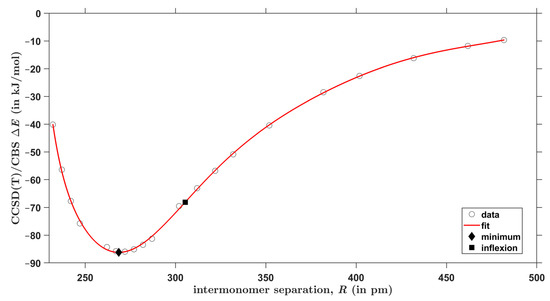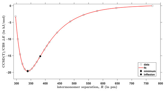 For each type of AAD models introduced in Section 2.2, the CCSD(T)/CBS interaction energies were obtained at 20 points in a wide range of the respective intermonomer separation as expressed by the parameter . There are two equivalent hydrogen bonds in every investigated geometry due to the C2h symmetry of both types of AA dimers. Figure 3 and Figure 4 graphically present the results for C–H⋯O and O–H⋯O interactions, respectively (all and values are collected in the Supplementary Materials Table S1, and the actual geometries and raw energies in “CHO.xlsx” and “OHO.xlsx” spreadsheets). The two sets of values were accurately fitted to the same functional form, which is specified in Section 4 (further details are given in Table S2). Then, minima were found at distances denoted as . Values of amount to 339 and 269 pm for C–H⋯O and O–H⋯O models, respectively, and the interaction energy at these points is −19.6 and −86.2 kJ/mol, respectively. These values are thus in a good agreement with the aforementioned results of the unconstrained MP2/aTZ optimization ( = 341 and 264 pm accordingly). Moreover, the interaction energies at the minima of relaxed geometries are accordingly −19.9 and −85.6 kJ/mol and thus are quite close to their counterparts obtained from the fits of data. It is worth noting that the fits also enable to estimate a maximal distance at which the investigated contacts become repulsive, that is, a value of for which = 0 kJ/mol. This distance is 294 and 226 pm for C–H⋯O and O–H⋯O interactions, respectively. Inflexion points of the fitted curves were located, too, and the corresponding distance between monomers is denoted as . Namely, of 382 and 305 pm, respectively, was found for the curves shown in Figure 3 and Figure 4 (related amounts to −15.2 and −68.1 kJ/mol, respectively). Positions of these inflexion points are analyzed in terms of the scaled intermolecular distance in Section 3 together with other parameters of the investigated PES. It is worth mentioning that results of the and calculations are −20.0 and −19.5 kJ/mol, respectively, for the structure fully optimized by the MP2/aTZ method and featuring C–H⋯O interactions. These values are −87.5 and −85.8 kJ/mol, respectively, for the MP2/aTZ optimized geometry with O–H⋯O H-bonding. It should also be mentioned that the accurately fitted dependencies of upon might be of interest in a development and/or testing of force fields [45].