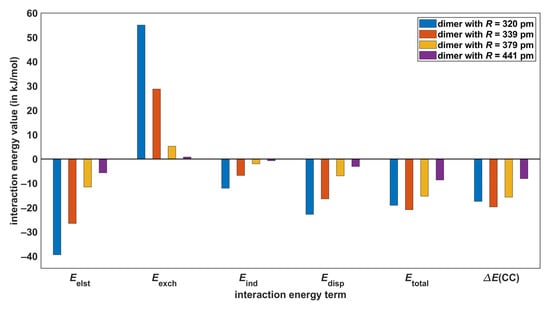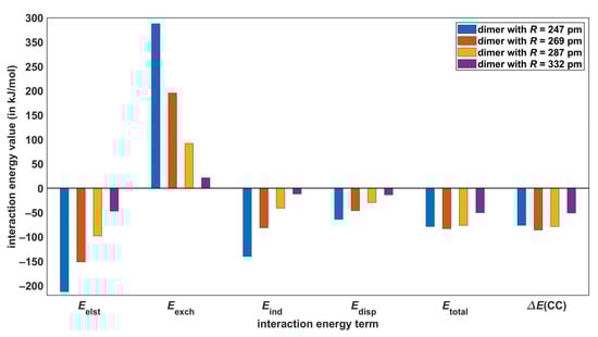 The SAPT-DFT method is a powerful tool for theoretical investigations of noncovalent bonding [46], while it is noted that also the energy decomposition analysis (EDA; see reference [47]) in the DFT framework can be usefully applied to noncovalent interactions [48,49]. The SAPT-DFT/CBS approach, which is specified in Section 4, enables accurate predictions of the intermolecular interaction energy (denoted as in the following). In particular, the root-mean-square deviation between the and corresponding CCSD(T)/CBS data (denoted as in the following) for a diverse set of 18 dimers was found to be as low as 0.84 kJ/mol [24]. At the same time, the SAPT-DFT technique partitions a value into well-defined contributions that stem from electrostatic, exchange, induction, and dispersion interactions [50]. These components of the total interaction energy are denoted here as , , , and , respectively, with = (see Section 4). Their dependence upon the distance in AA dimers was followed (all underlying values are collected in Table S3). Results are presented in Figure 5 and Figure 6, where also pertinent data are included for comparison purposes. The key values are listed in Table 3 and reveal that the biggest absolute difference between the reference results and their counterparts is 2.8 kJ/mol and occurs in the model of O–H⋯O interactions with = 247 pm (the relative difference of these interaction energies is 3.7%), while the highest relative difference amounts to 9.2% (in the case of the C–H⋯O model with = 320 pm). The present SAPT-DFT/CBS data can thus be considered to be reliable throughout the investigated ranges of intermonomer separations and are analyzed below.