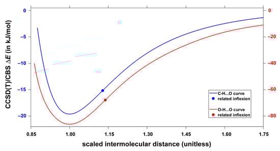 The most recent review article [61] stressed the importance of a proper denomination of weak interactions in various kinds of aggregates. For a quantification of multitude of intermolecular contacts, it should be beneficial to apply high-level quantum chemical calculations to models that avoid competing structural effects [62]. This way the intrinsic strength of the respective types of noncovalent bonding can be obtained. Here, the CCSD(T)/CBS approach was used to predict the intermolecular interaction energy as a function of the C–H⋯O or O–H⋯O H-bonding distances in analogous environments provided by the topology of acrylic acid dimers (see Section 2.2 and Section 2.3). Accurate fits of resulting to the same functional form were obtained and enable a side-by-side comparison of the two interactions. It is convenient for such comparison to employ the relative distance, , with the respective values specified in Section 2.3. Figure 7 depicts the dependence of two sets of interaction energies upon the same data ranging from about 0.86 up to 1.75. In relative terms, the two curves are very similar (see Figure 7). In particular, inflexion points of the C–H⋯O and O–H⋯O models lie at = 1.128 and 1.138, respectively. The two sets, however, span completely different intervals of absolute values in the investigate range of . For instance, = −15.0 kJ/mol for the C–H⋯O model is reached at around = 0.924 in the descending part of the dissociation curve, while at this relative distance the O–H⋯O model features as high as −76.1 kJ/mol. Additionally, at and distances, the interaction energy of the O–H⋯O arrangement is over four times higher than exhibited by its C–H⋯O counterpart (see Section 2.3 for details). Consequently, the intrinsic strength of the C–H⋯O interaction is much lower than could be anticipated on the basis of, for example, experimental estimates of interaction energies in fragments of crystalline austdiol (C12H12O5) featuring either C–H⋯O or O–H⋯O HBs [63], and the data obtained for N-methylacetamide:dimethylformamide dimers containing either C–H⋯O or classical N–H⋯O HBs [64]. This finding is in line with conclusions of the most recent computational study of host–guest interactions, where the C–H⋯O H-bonding was found to be weak, yet very important for the thermodynamic stabilization of certain complexes [65].