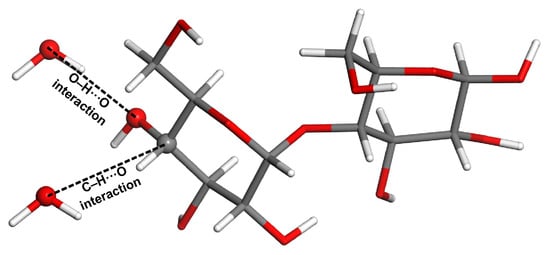 It should be of interest to reproduce the aforementioned finding in some more complex systems. Consequently, using the coordinates of β-maltose from the ND study [66], the cluster was prepared in order to study C–H⋯O and O–H⋯O H-bonding separately, but in the same structural environment (see Figure 8). Two dimers are thus considered that both contain one β-maltose and one water molecule. Respective water molecules replace the neighboring β-maltose featuring either C–H⋯O interaction (in this case the C–O distance is 366 ppm) or O–H⋯O interaction (the distance between pertinent oxygen atoms is 277 pm). Due to the size of these dimers (48 atoms), the canonical CCSD(T)/CBS calculations of the interaction energy would be impractical. Hence, the values were obtained instead. They amount to −4.9 and −17.2 kJ/mol for the model of C–H⋯O and O–H⋯O interaction, respectively (the corresponding results are −4.4 and −16.8 kJ/mol). These data show that the intrinsic strength of the C–H⋯O interaction is about a quarter of its O–H⋯O counterpart.