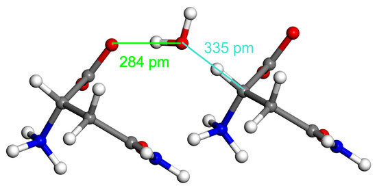 Furthermore, the present theoretical approach was used in order to compare C–H⋯O and O–H⋯O H-bonding arrangements that involve a crystalline water molecule. The ND structure of L-asparagine monohydrate [67] is suitable for such a comparison. As shown in Figure 9, both C–H⋯O and O–H⋯O HBs are formed by the water that bridges L-asparagine molecules, which are positioned approximately in a direction of the crystallographic a axis of the structure from reference [67]. Hence, clusters that contain this water molecule and the pertinent L-asparagine were prepared and the , , and values were established while employing the ND geometry. Results are summarized in Table 4 (the underlying absolute energies are available from related Excel spreadsheets included in the Supplementary Materials). As expected, the interaction energy values computed by the three high-level methods agree with each for both types of H-bonding. Data in Table 4 reconfirm the finding presented above, as they show the O–H⋯O interaction to be about four times stronger than its C–H⋯O counterpart in essentially the same structural environment.