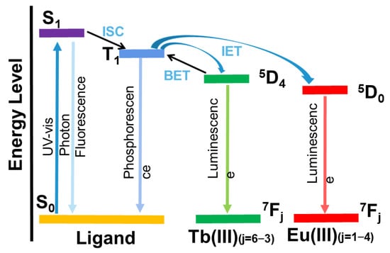 Process of energy absorption and conversion of Tb(III)/Eu(III) complexes. (ISC: intersystem crossing; IET: intramolecular energy transfer; BET: back energy transfer).