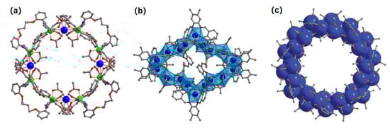 The high-nuclearity lanthanide nanorings. (a) Cd8Nd4 (Cd: green, Nd: blue, O: red, C: gray). Adapted with permission from Ref. [44], 2021, American Chemical Society. (b) Yb18 (Yb: blue, O: red, C: gray). Adapted with permission from Ref. [45], 2022, Elsevier. (c) Yb42 (Yb: blue, O: red, C: gray). Adapted with permission from Ref. [47], 2019, The Royal Society of Chemistry.