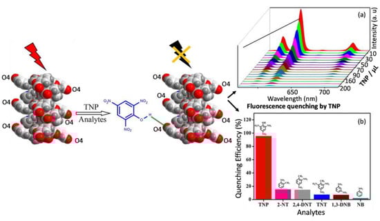 Following the rapid development of modern industry, domestic wastewater, agricultural wastewater and pharmaceutical wastewater contain more and more pollutants, such as metal cations, anions, antibiotics, pesticides, nitro aromatic compounds and so on, which are making water environmental pollution more and more serious [1,2,3]. Among these pollutants, the toxic and explosive nitroaromatic compounds are often used as the starting materials for the preparation of dyes and explosives in the chemical industry. It should be noted that highly toxic nitroaromatics are extremely difficult to be degraded due to their structural and chemical stability. For example, nitrobenzene (NB) is the simplest and smallest molecule in nitroaromatics, which is often used as the intermediate and raw materials for the productions of dyes, fragrances, explosives and other aniline products in the organic synthesis industry. Inhalation of toxic NB vapor or skin contamination can cause acute poisoning, headache, nausea, vomiting and so on [4,5,6]. Furthermore, 4-Nitrophenol (4-NP) is mainly used as an intermediate in pesticide, pharmaceuticals, dyes and other fine chemicals [7,8]. In addition, 2,4,6-trinitrophenol (TNP), as the main component of explosives and gunpowder, is commonly used in the manufacture of dyes, preservatives and medicines. Wastewater from these industries needs to be monitored and treated to prevent environmental pollution [9,10]. Especially, high physiologically toxic nitroaromatics are harmful to (ground)water, soil resources and human health when released into the environment. Therefore, the detection of nitroaromatic compounds is of great significance to environmental monitoring, citizen safety and homeland security [11,12,13,14,15]. At present, the analytical methods for detecting harmful substances in the environment mainly include atomic absorption spectroscopy [16], mass spectrometry [17], optical gas chromatography-mass spectrometry [18], gas chromatography-electron capture detection [19], surface-enhanced Raman spectroscopy [20,21], X-ray imaging [21], thermal neutron analysis [21], electrochemical procedures [20] and ion mobility spectroscopy (IMS) [20,21] and molecularly imprinted polymers (MIPs) [22]. Note that fluorescence detection is a simple, convenient, highly sensitive method for monitoring pollutants in wastewater [23,24,25] and vapor phases [26,27,28], and even in commercial honey samples [29]; no special instructions are required compared with other methods, while rapid and real-time detection is provided, and fluorescence detection has demonstrated good sensitivity and selectivity.