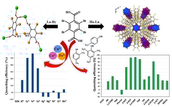 - Sun, Z.; Sun, J.; Xi, L.; Xie, J.; Wang, X.; Ma, Y.; Li, L. Two Novel Lanthanide Metal–Organic Frameworks: Selective Luminescent Sensing for Nitrobenzene, Cu2+, and MnO4−. Cryst. Growth Des. 2020, 20, 5225–5234. [Google Scholar] [CrossRef]